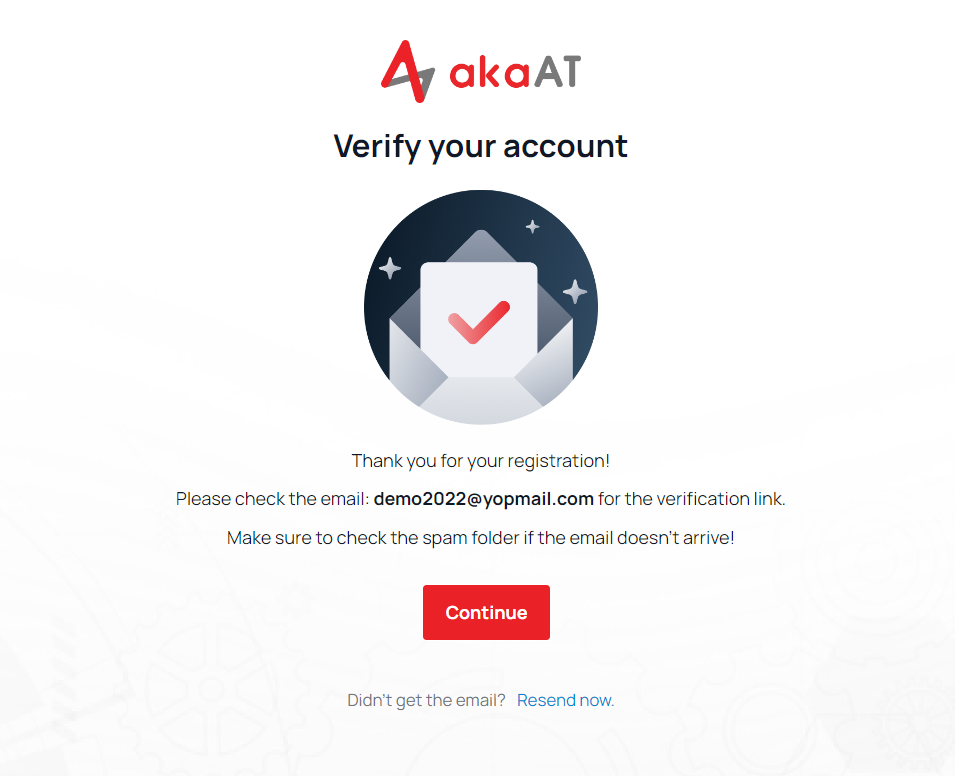 - Bước 3: Sau khi bấm vào nút [Create account now], bạn sẽ được đưa đến một thông báo - Bấm Tiếp tục để quay lại trang đăng nhập và kiểm tra email của bạn. - Nếu bạn không nhận được mail từ akaAT, vui lòng đợi ít nhất 3 phút. Sau thời gian đó, bạn có thể nhấp vào nút [Resend now] để gửi lại mã xác nhận.