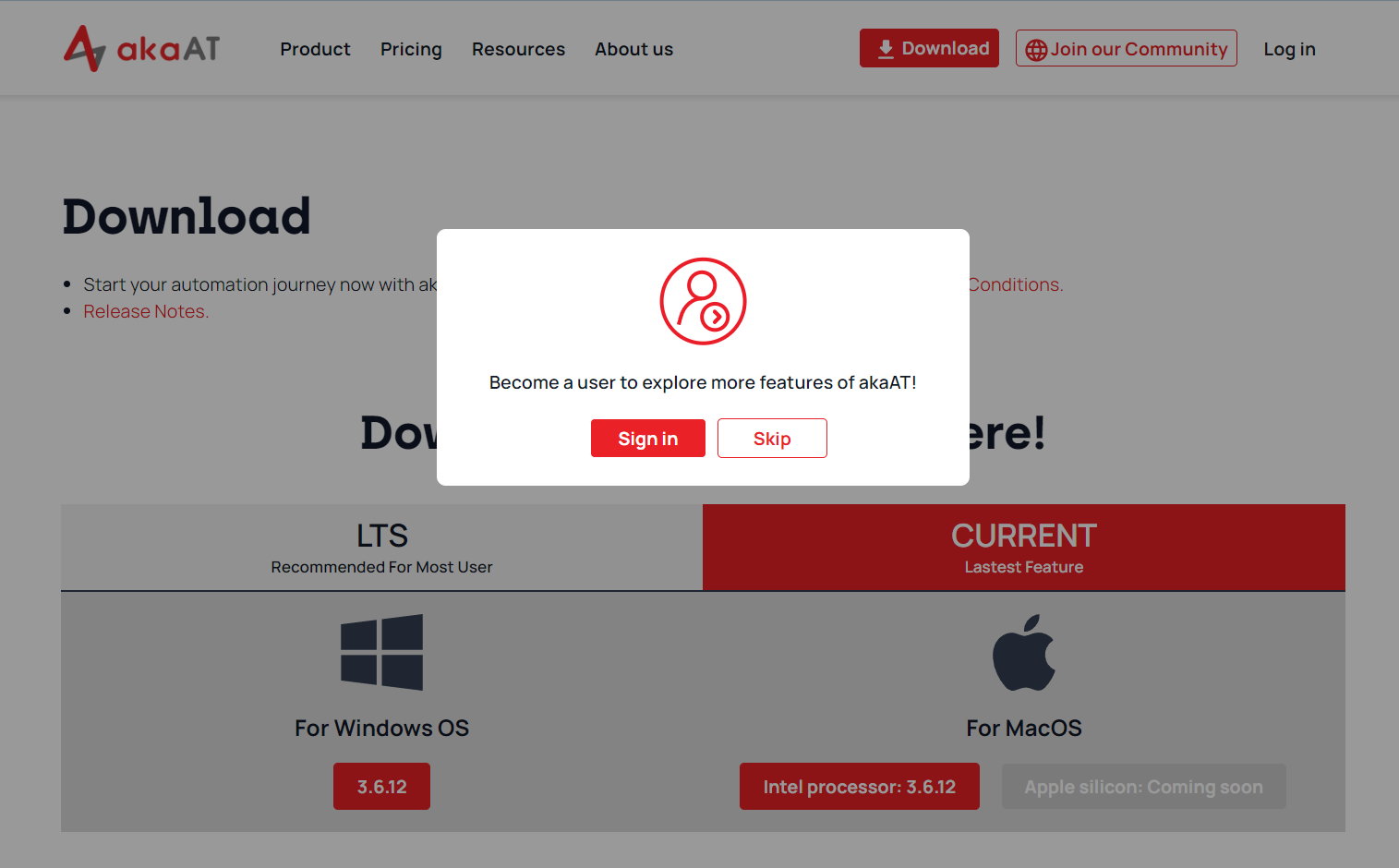 - Bước 1: Truy cập trang chủ web akaAT sau đó nhấp vào nút Download. Sau đó, bạn sẽ được điều hướng đến màn hình chọn phiên bản và hệ điều hành nào.
