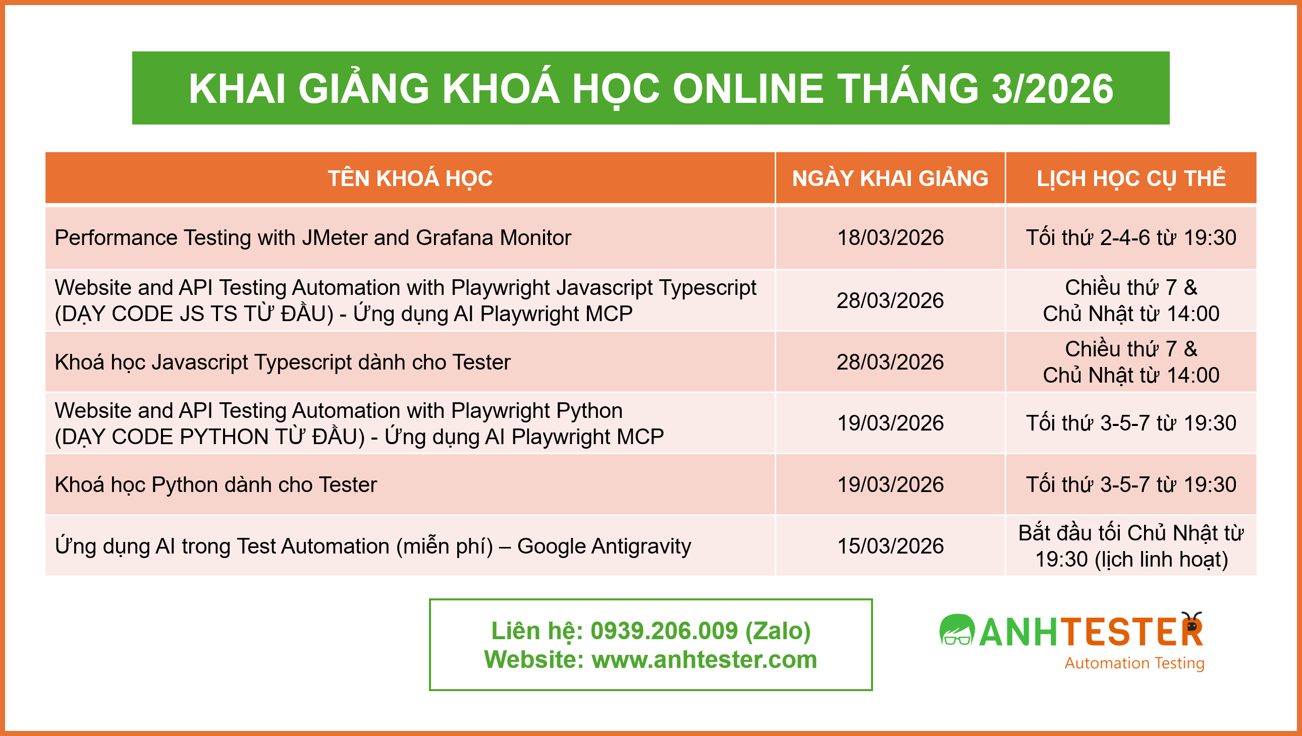 Anh Tester vừa cập nhật các khoá học Online qua ZOOM mới như Performance Test với JMeter Grafana, Playwright JS/TS, Playwright Python, Ứng dụng AI trong Test Automation tháng 03/2026.