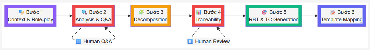 AI cần thời gian phân tích và đưa ra câu hỏi. Nếu chạy 1 lèo → AI tự đoán mò logic → Test Case sai trầm trọng. - Điểm chốt chặn nhân sự (Human in the Loop):
