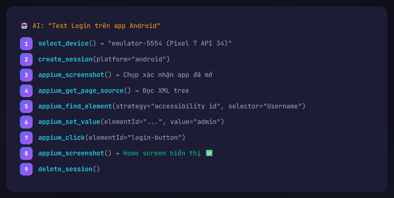 | AI Vision (tìm element bằng ngôn ngữ tự nhiên) | ❌ | ✅ (Appium MCP) |