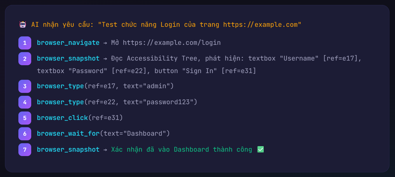 | Cách tìm element | ref từ Accessibility Snapshot(AI tự đọc DOM → lấy ref ID) |