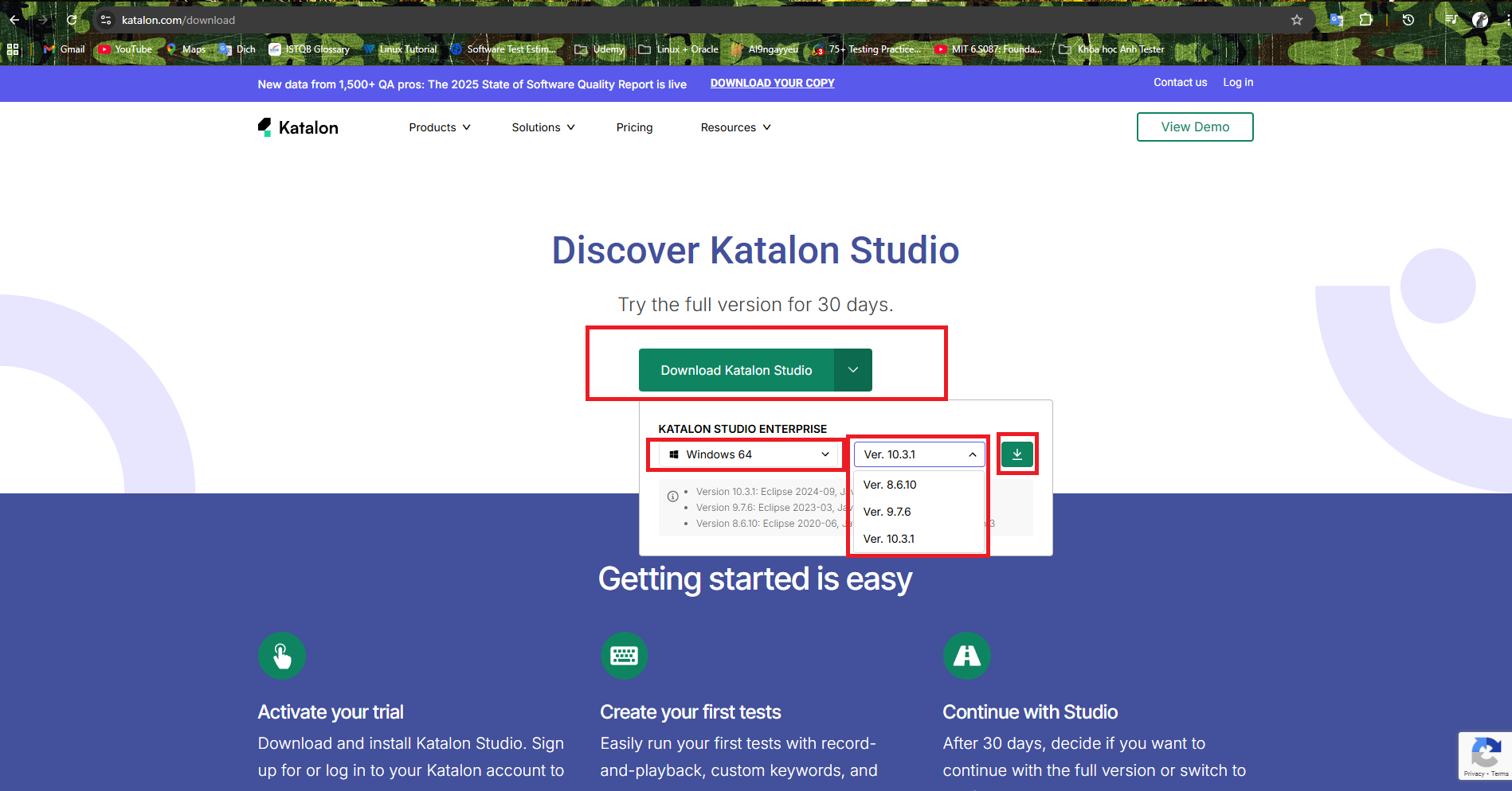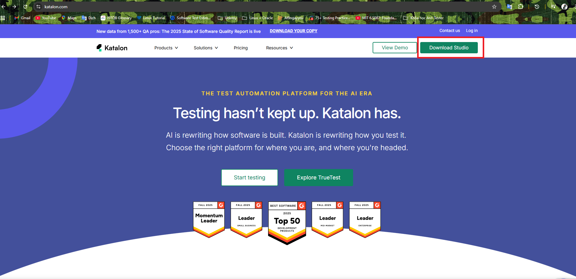- Trên trang chủ Katalon --> Nhấn [Download Studio]