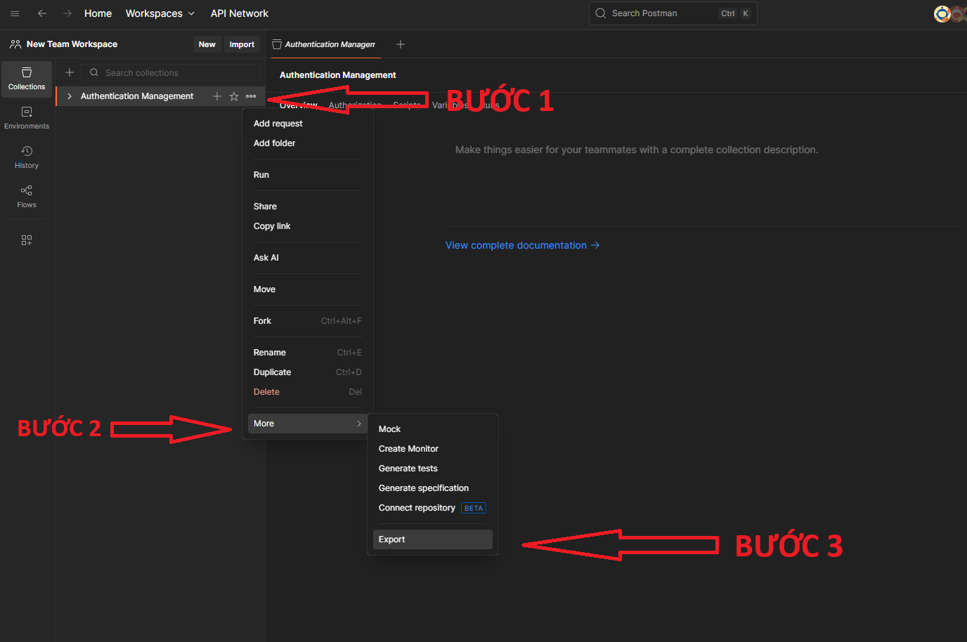 Xuất (Export) bộ sưu tập (Collection) của bạn từ Postman ra thành một tệp tin định dạng JSON. (Thực hiện các bước như hình vẽ dưới đây)