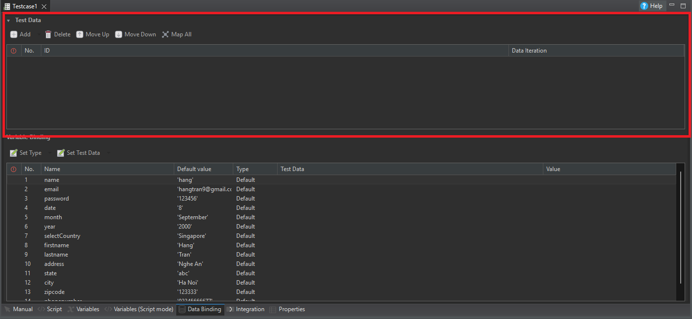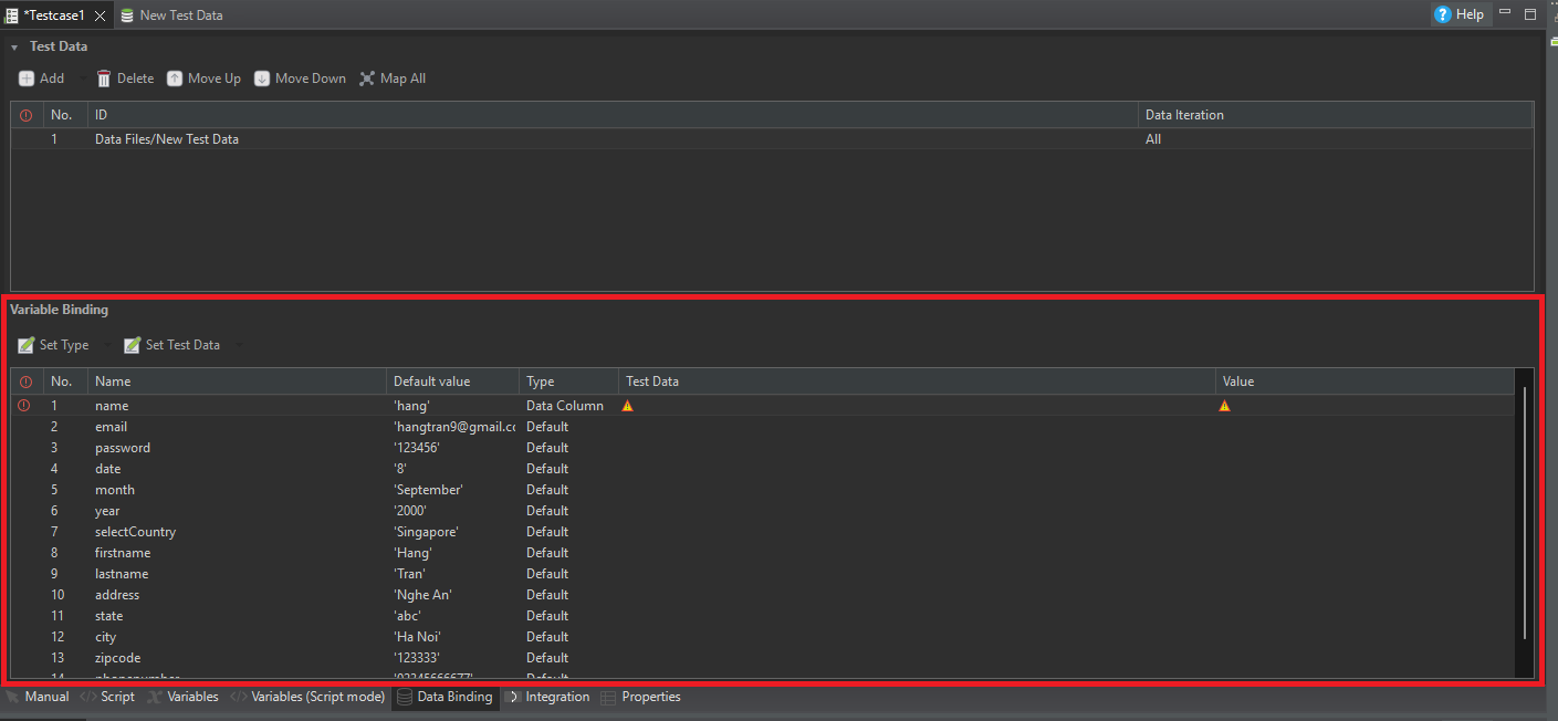 - Trong file Test case, phần Data Binding, sau khi thực hiện thêm file *.dat, Nhấn nút [Map All]