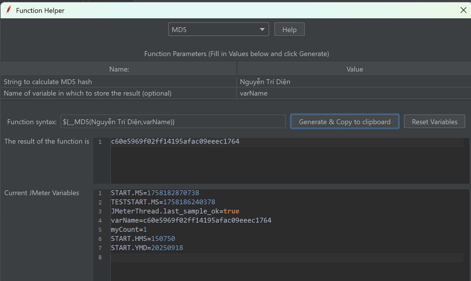 - Cú pháp: ${__MD5(String,varName)}