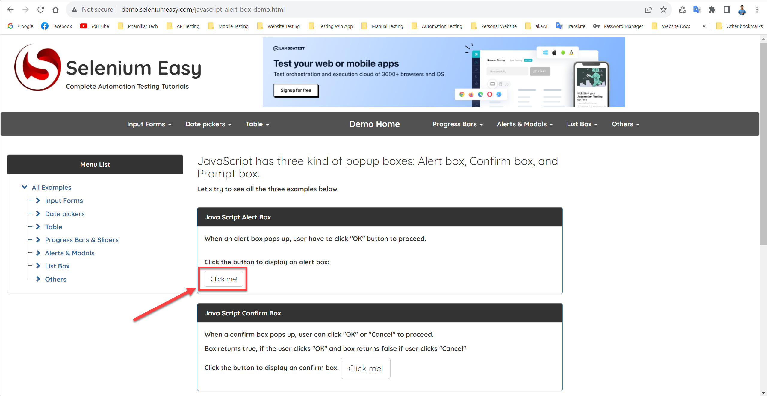 Bước 1: Vào website https://www.lambdatest.com/selenium-playground/javascript-alert-box-demo
