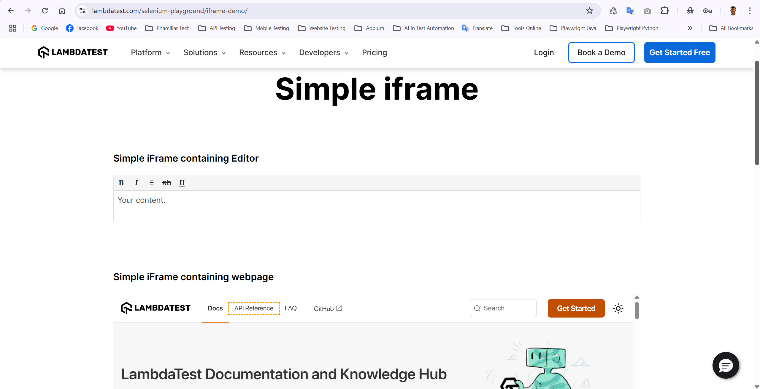 Code mẫu xử lý trên trang https://www.lambdatest.com/selenium-playground/iframe-demo/