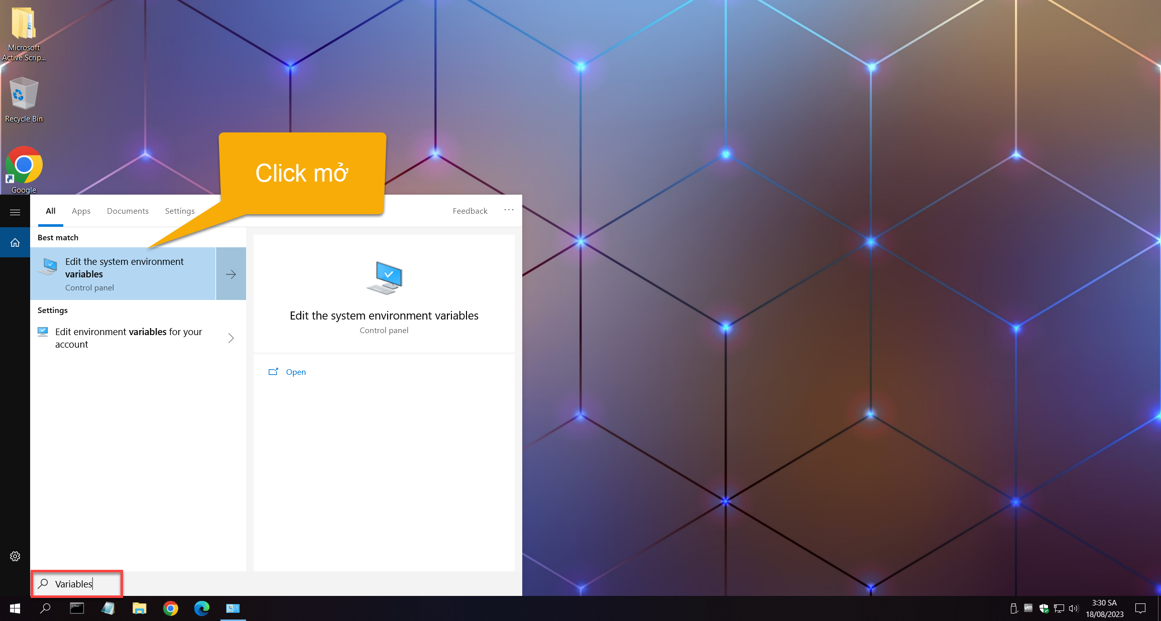 hoặc có thể search cho nhanh với giá trị là "Variables" rồi click chọn menu "Edit the system environment variables" như hình